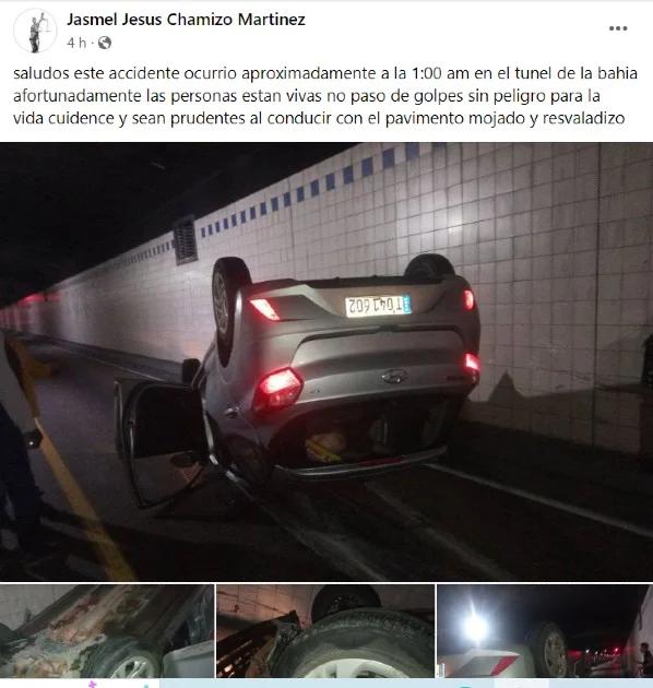 “Este accidente ocurrió aproximadamente a la 1:00 am en el Túnel de la Bahía. Afortunadamente las personas están vivas, no pasó de golpes sin peligro para la vida. Cuídense y sean prudentes al conducir con el pavimento mojado y resbaladizo”, comentó un usuario en el grupo ‘Accidentes Buses & Camiones ¡Por más experiencia y menos víctimas! De Facebook.