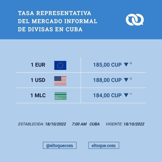 Este martes 18 de octubre del 2022 hizo una semana que el dólar estadounidense en el mercado informal cubano estuvo bajando su precio, teniendo este día un valor de 1 x 188 pesos cubanos (CUP).